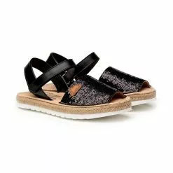 Abarcas Menorquinas Niña Piel Y Lentejuelas Plantilla Acolchada Velcro 224 Negro, De Angelitos